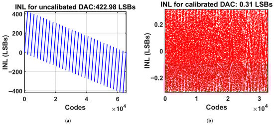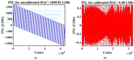 This represents a significant improvement over the prior state of the art. For instance, the architecture in [25] reported a worst-case post-calibration INL of 0.78 LSB and a DNL of 0.94 LSB for a 13-bit target resolution. An INL greater than 0.5 LSB can compromise a device’s effective resolution. Under the same post-calibration resolution, the proposed design achieves a worst-case INL of 0.24 LSB and a DNL of 0.38 LSB. This substantial enhancement is attributed to key architectural innovations.