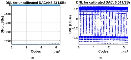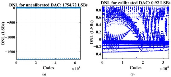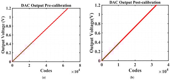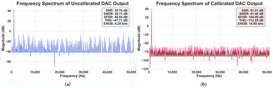 The dynamic performance of DAC structure 2 was evaluated through the spectral analysis of its output, both before and after calibration, as illustrated in the magnitude spectrum plots (Figure 14). The post-calibration spectrum demonstrates a substantial enhancement in signal integrity, characterized by a marked suppression of spurious tones and a significant reduction in harmonic distortion. This improvement is quantified by key performance metrics, with the Signal-to-Noise Ratio (SNR) increasing from dB to dB, the Spurious-Free Dynamic Range (SFDR) improving from dB to dB, the Signal-to-Noise and Distortion Ratio (SNDR) increasing from dB to dB, and the Total Harmonic Distortion (THD) reducing from dB to dB. Consequently, the Effective Number of Bits (ENOB) increased from 6.20 bits to 14.90 bits. These results underscore the efficacy of the proposed digital calibration algorithm in mitigating nonlinearities. The significant improvements across all measured dynamic performance metrics confirm that the calibration process not only enhances static linearity but also translates directly into a cleaner, more accurate analog output signal under dynamic conditions. The substantial increase in ENOB, in particular, validates the design’s ability to achieve high resolution.