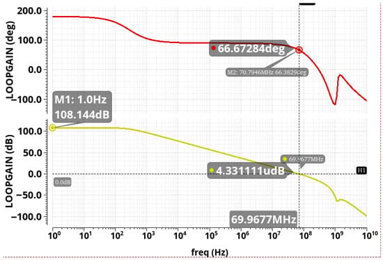 DAC structure 2 achieves a significant improvement in linearity over both DAC structure 1 and the architecture in [25] at the nominal and PVT (Process, Voltage, Temperature) corners. Simulation results at the nominal corner show a post-calibration INL of 0.31 LSB (9.51 ppm) and DNL of 0.54 LSB (16.43 ppm). A detailed comparison of the pre- and post-calibration INL and DNL plots is provided in Figure 8 and Figure 9, while the overall transfer curve for the target resolution is shown in Figure 10. The stability of the design is supported by the robust performance of its LSB differential pair interpolator, which exhibits a measured gain of 108 dB and a phase margin of 66°, as depicted in Figure 11.