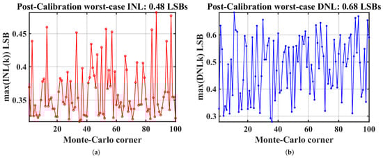 A data converter’s robustness against device mismatches and random manufacturing variations is primarily quantified by its static linearity metrics, namely, INL and DNL. For high-precision applications, achieving an INL below 0.5 LSB and a DNL of less than 1 LSB is a critical design target. The Monte Carlo simulation results confirm that our design comfortably meets these targets.