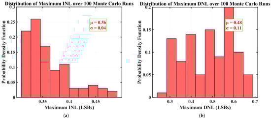 The probability density function (PDF) plots for INL and DNL are presented in Figure 13. The simulation yields a mean () of 0.36 LSB and a standard deviation () of 0.04 LSB for the maximum INL across 100 Monte Carlo runs. Similarly, the maximum DNL shows a mean of 0.48 LSB and a standard deviation of 0.11 LSB.