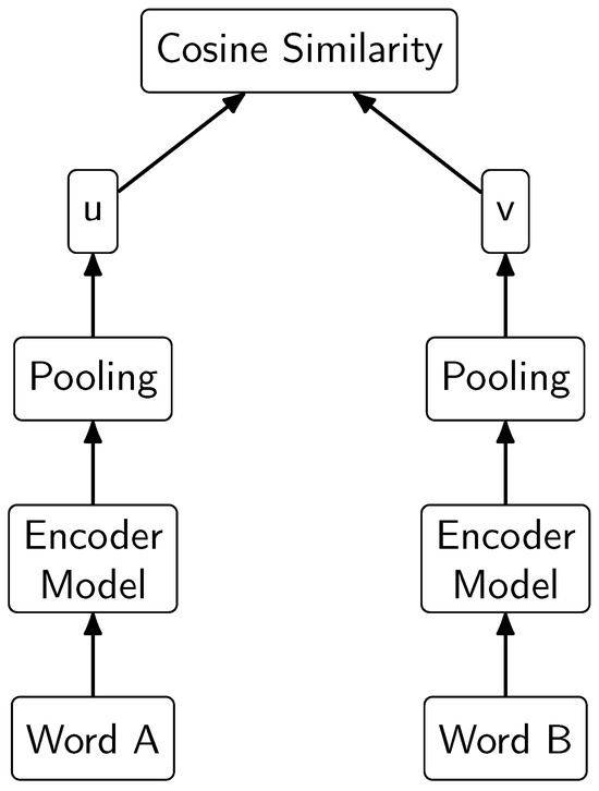 Our approach employs Sentence Transformers, a bi-encoder architecture wherein a Transformer model encodes both target and guess in parallel. Figure 1 illustrates the bi-encoder architecture used for evaluating semantic similarity between words in our system. In this setup, each input word, the target word (Word A) and the user’s guess (Word B), is independently processed by an identical encoder model. The models encode each input word, generating contextualised token representations. These representations are subsequently transformed into fixed-size sentence embeddings via a pooling operation (such as taking the [CLS] token or averaging all token embeddings), resulting in two dense vectors, denoted u and v. Finally, the semantic similarity between these two vectors is computed using cosine similarity. The resulting score quantifies the semantic proximity between the guess and the target word, enabling the system to provide meaningful feedback based on the user’s input. This architecture allows for efficient and scalable evaluation, as both words can be encoded in parallel, and is well suited for real-time applications like interactive word games.