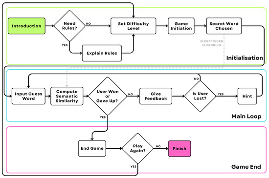 Flow diagram of the game performance. Initialisation introduces the game, optionally explains the rules, sets the difficulty level, starts the game, and selects the secret word (its embedding is stored; the dashed arrow indicates its use in the similarity calculation). In the main loop, the user enters a guess word, we calculate its semantic similarity to the secret word and branch as follows: if the user has won or given up, the loop ends; otherwise, we provide feedback and, if the user is stuck, give them a hint before the next guess. Finally, the user can start another round or end the game.