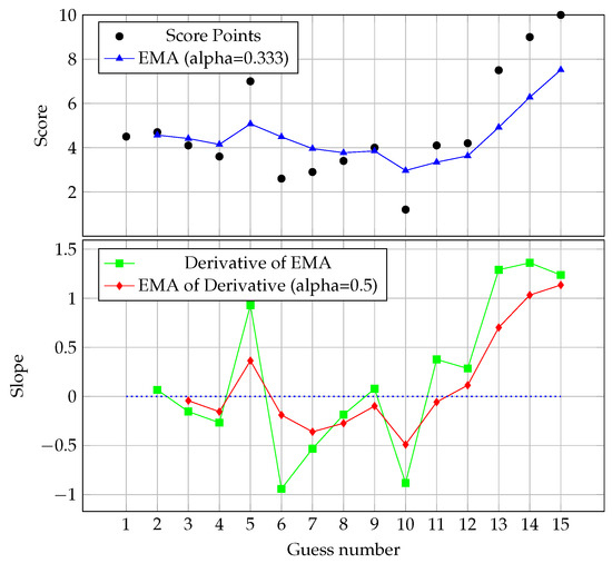 Given the slope of user performance in each game iteration, we can observe a trend in the performance metrics. However, these metrics are notably volatile and significantly influenced by game iteration changes. To address this, we further smooth the slope signal by applying a second EMA to the derivative, using a window of three samples (n = 3), corresponding to a smoothing factor of ( = 0.5). This approach provides a more nuanced smoothing, balancing capturing immediate changes and mitigating aggressive spikes in our metrics. The outcomes of our approach are illustrated in the lower part of Figure 3, which displays the derivative (slope) of the EMA (green squares), alongside an EMA-smoothed estimate of the derivative itself (red diamonds). When the slope is close to zero, user performance is stable. Positive slope values signal improving performance, while negative slope values suggest declining performance. For instance, in guesses 5 to 9, the negative slope indicates a decline in performance, which could be an optimal point to trigger an intervention or provide a targeted hint. Conversely, after guess 13, the trend reverses, reflecting a rapid improvement captured by the raw and smoothed slope curves.