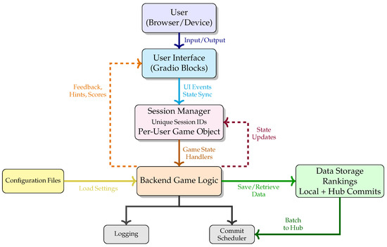 - Data Storage (Rankings, Local + Hub Commits): Stores play sessions and rankings in local JSON files with automated saving and synchronisation to a Hugging Face Hub repository for persistent data management.