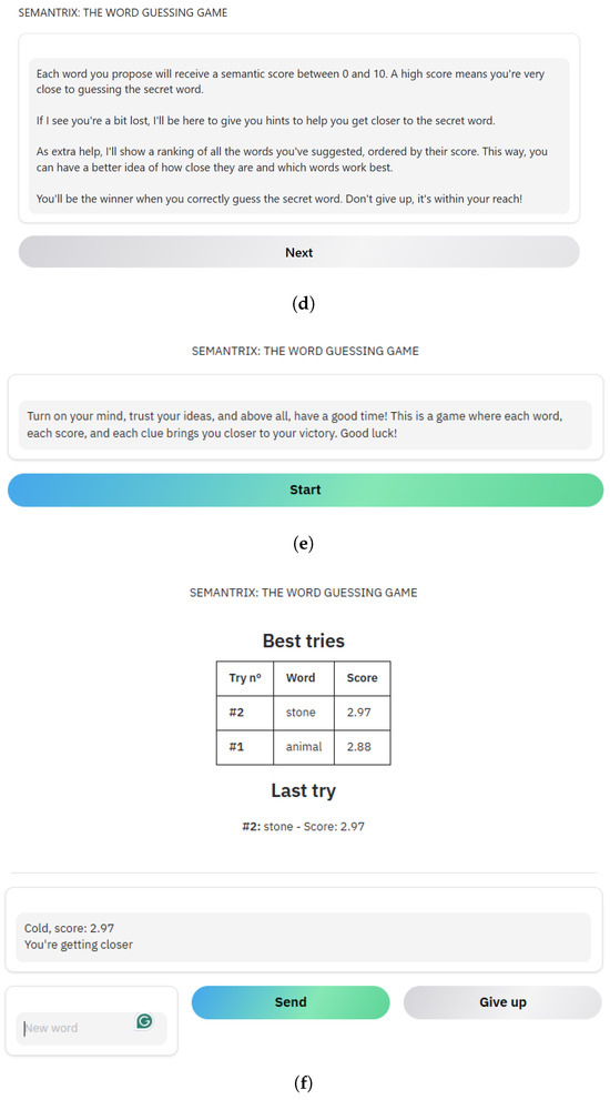In this section, we aim to present the overall design of the game experience, detailing its structure and individual modules, which are elaborated upon later. The game’s main objective is for the user to guess a secret word. Initially, the user may attempt different words randomly, but their guesses should become more refined as the game progresses; this way, a secondary objective is to make this process of knowledge refinement mentally stimulating for the user.