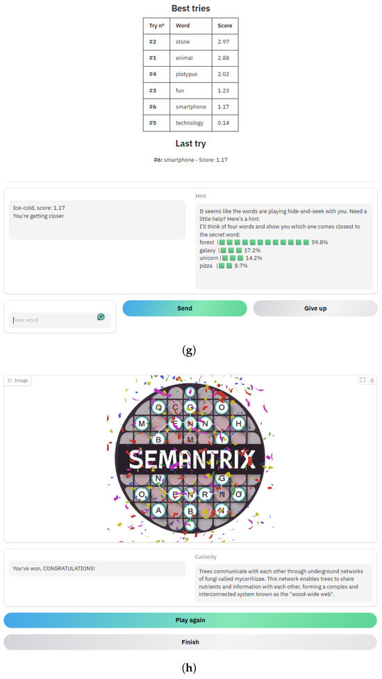 We derive the cosine value through this transformation. Then, once multiplied by ten, we obtain a semantic score over ten, quantifying the semantic similarity between the guessed and secret words. This quantified measure of similarity forms the foundation of our feedback. Similarly, all the scores obtained during each round are recorded to analyse the user’s performance within the hint system. This data collection also serves the secondary purpose of informing the user about the words they have attempted during the game that are closest to the secret word. This allows users to leverage this information in the game’s feedback mechanism. Tracking these scores can give users detailed insights into their guessing patterns and improve the gameplay experience. The stored data help refine the hint system and ensure that users can learn from previous attempts, enhancing their strategy with each subsequent guess.