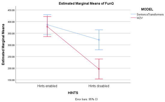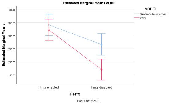 Intrinsic motivation, measured via the adapted IMI, was reliably increased by providing adaptive hints but not as a main effect of the underlying semantic model. Notably, a significant interaction was found, indicating that the motivational advantage of semantic Transformers manifests most strongly when hints are absent. This pattern suggests that motivational benefits may arise from either deeper semantic feedback or a supportive hint system, but not necessarily from both simultaneously, pointing to a kind of “motivational redundancy” in their combined application. Although the Model’s main effect on intrinsic motivation did not reach significance (), the partial eta-squared () suggested a small-to-moderate trend. Together with the significant Model × Hints interaction and the estimated marginal means, shown in Figure 7, this is compatible with a motivational redundancy theory: adaptive hints robustly increase perceived competence and thus intrinsic motivation. At the same time, richer semantic feedback from Sentence Transformers contributes to motivation mainly when hints are disabled. On the other hand, we note that the unequal sample sizes, particularly in the Word2Vec + No Hints condition, may have reduced sensitivity to small main effects on IMI; estimates should therefore be treated as relative (see Section 8 for details). In terms of use cases, we can say that these results could point to the importance of detecting the moment and adjusting the appropriate level of hints to preserve the “productive struggle” and, on the other hand, suggests that advanced semantic modelling may be particularly valuable for maintaining motivation in contexts where the hint system is unable to provide sufficient support to the user, while more consistently benefiting engagement and enjoyment in all circumstances.