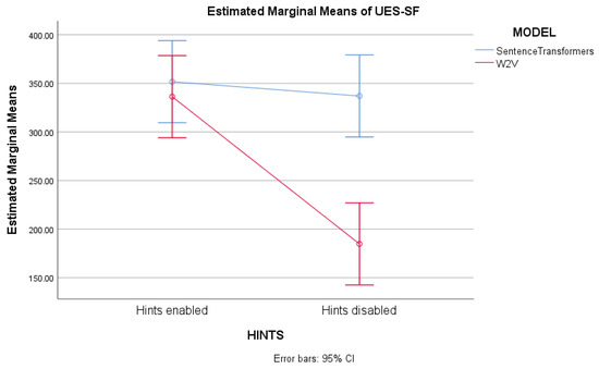 Estimated marginal means (±95% CI) of UES-SF (engagement) by Model and Hint condition in the 2 × 2 design. Lines connect hint conditions within each model; higher values indicate a more positive self-report. Note: Periods indicate decimal points.