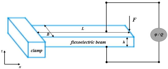 The flexural material under study is ferroelectric ceramic material barium titanate [32], and L, B, and h are used to represent the length, width, and height of the flexible electron beam structure, respectively. The model of a flexoelectric beam is shown in Figure 1. It is assumed that the impact of ultra-thin, fully smeared electrodes on the upper and lower layers of the flexoelectric beam is negligible. When the ratio of beam length to thickness ≥ 10, shear deformation can be neglected, which is consistent with the Euler–Bernoulli beam hypothesis.
