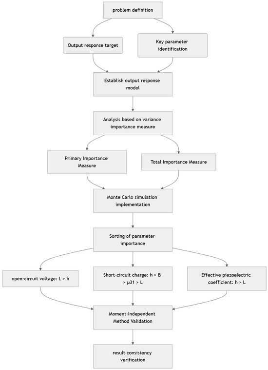 For instance, Professor Li and his team proposed a sensitivity analysis method for flexoelectric materials based on a polynomial chaos expansion (PCE) surrogate model [31]. The fourth-order partial differential equation of flexoelectricity based on non-uniform rational B-spline (NURBS) basis functions was discretized to obtain a deterministic solution (potential). By considering uncertain parameters, the mathematical expression of the flexoelectric material surrogate model was established. However, it has the limitations of only targeting a single electric potential output and relying on local sensitivity analysis, which cannot clearly quantify the dominant role of key parameters (such as thickness in open-circuit voltage and effective piezoelectric coefficient) under different working conditions. This paper innovatively adopts a variance-based global importance measure method, combined with moment independence verification, to systematically analyze the global influence of six types of parameters (flexoelectric coefficients, geometric dimensions, material properties) under three output states: open-circuit voltage, short-circuit charge, and effective piezoelectric coefficient, providing a more comprehensive and robust theoretical support for the reliability optimization and macroscale application of flexoelectric structures.