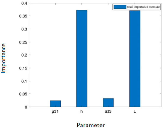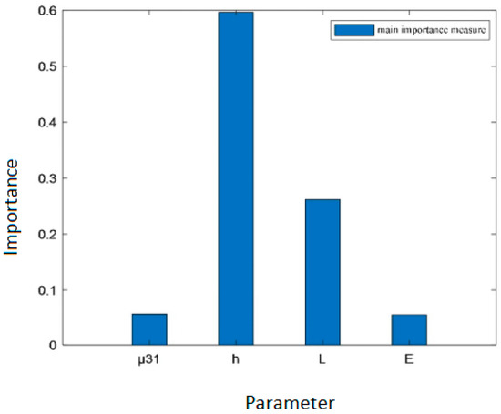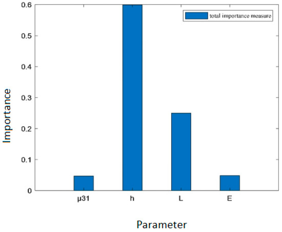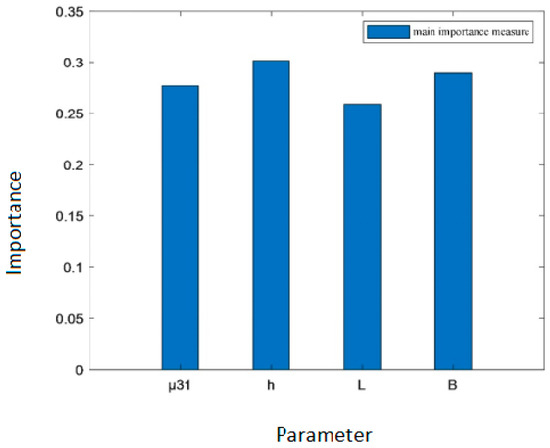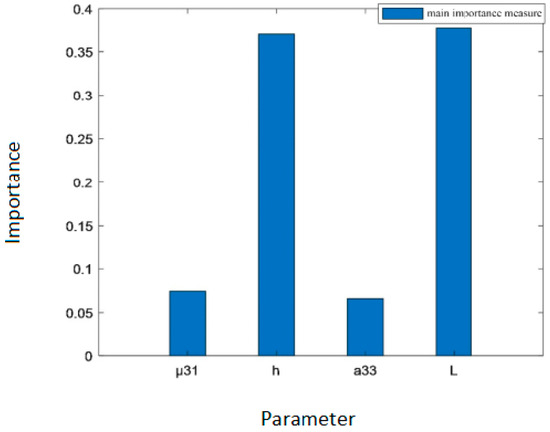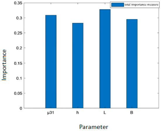 As shown in Table 3, the order of the total importance measure of the four parameters of the flexure electric beam is , indicating that the order of the importance of the four parameters’ influence on the total variance in the output voltage is . Thickness has the greatest influence, followed by length , while the dielectric coefficient and the flexure electric coefficient have relatively lesser influences.