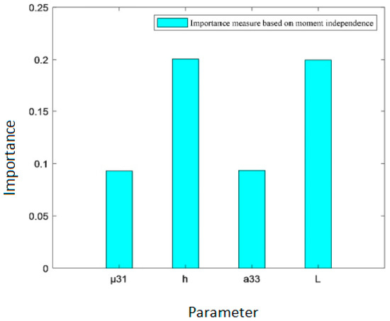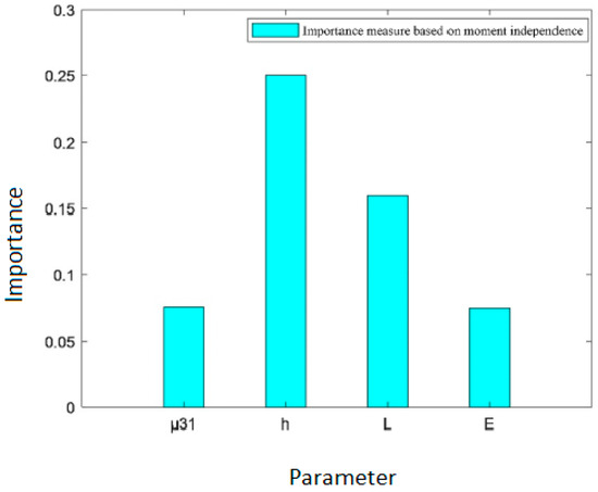 As shown in Table 10, the independent importance measure of effective piezoelectric coefficient moment is ranked as , in which thickness exerts the greatest influence, followed by length , and the flexure electric coefficient and Young’s modulus have relatively minor effects. This is basically consistent with the result given by the variance importance measure in Section 3.1.