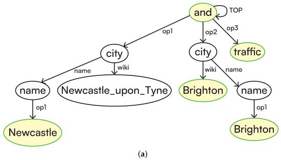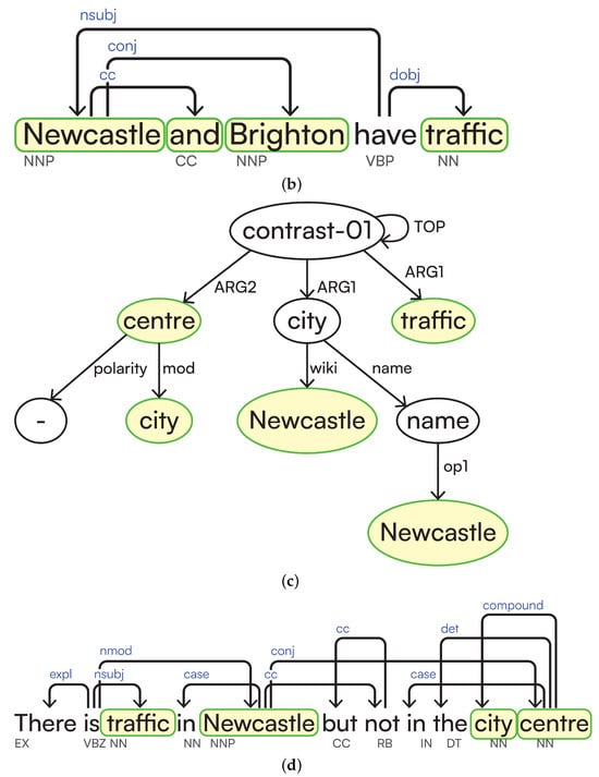 Visualisation of the differences between Part of Speech (POS) tagging, AMR graphs, and UDs, providing more explicit relationships between words. AMRs were generated through AMREager (https://bollin.inf.ed.ac.uk; accessed on 24 April 2025), while UDs were generated using StanfordNLP []. Graphs are highlighted to word correspondences, represented as graph nodes. (a) AMR for “Newcastle and Brighton have traffic”: “and” is conjoining the subject with the direct object, losing grammatical distinction between them (op1, op2, and op3). (b) POS tagging (below) and UD (above) for “Newcastle and Brighton have traffic”: there is a clear distinction between subject and direct object; “Newcastle” and “Brighton” are joined by a conj, and the verb “have” relates to “traffic” through a dobj. (c) AMR for “There is traffic in Newcastle but not in the city centre”: despite contrast-01 highlighting the opposite sentiment between “traffic in Newcastle” and “city centre”, verb information is lost. (d) POS tagging (below) and UD(above) for “There is traffic in Newcastle but not in the city centre”: all the desired information is retained, other than a negation dependency that should be extracted from “not”.