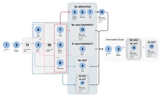 We show how different types of SetOfSingletons generated from distinct UD relationships lead to intermediate graphs. We showcase coordination (e.g., AND and NOT), multi-word entities (e.g., GROUPING), and multiple logical functions (e.g., MULTIINDIRECT). The sequence of changes highlighted in the central column is applied by visiting the graph in lexicographical order [] in order to start changing the graph from the nodes with fewer edge dependencies. The box colours refer to different groups of nodes within the transformation.