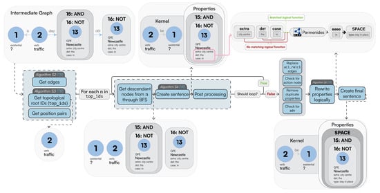 A broad view of the ad hoc phase of the pipeline. With the intermediate graph generated, we iterate over each topologically sorted root node ID and create the final sentence representation. [TR] refers to our technical report [].