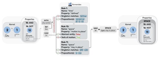 This rewriting mechanism exploits grammar rules found in any Italian linguistic book ([], Supplement II.1), and is therefore easily accessible. To avoid hardcoding these rules in the pipeline, we declaratively represent them as instances of LogicalRewriteRule concepts within our Parmenides Upper Ontology ([], Figure 9a). These rules can be easily interpreted as Horn clauses ([], Figure 9c). These are used in LaSSI to support further logical functions by extending the rules within the ontology rather than changing the codebase. Figure 6 summarises the contribution of [], Algorithm S6. For each sentence node (either SetOfSingletons or Singleton), we obtain its properties and test all the rules, as stored in Parmenides, in declaration order. Upon the satisfaction of the premises, the rule determines how to rewrite the matched content as either properties of the relationship or of the aforementioned node.