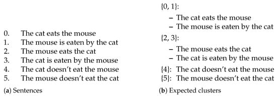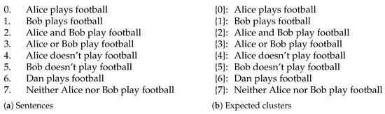 A recent survey conducted by Seshia et al. introduced the notion of verified Artificial Intelligence (AI) [], through which we seek greater control by exploiting reliable and safe approaches to derive a specification  that describes abstract properties of the data . Through verifiability, the specification itself  can be used as a witness of the correctness of the proposed approach by determining whether the data satisfy such specification, i.e.,  (formal verification). This survey also revealed that, at the time of its writing, providing a truly verifiable approach of NLP is still an open challenge, remaining unresolved with current techniques. In fact, specification  is not simply considered the outcome of a classification model or the result of applying a traditional explainer, but rather a compact representation of the data in terms of the properties it satisfies in a machine- and human-understandable form. Furthermore, as remarked in our recent survey [], the possibility of explaining the decision-making process in detail, even in the learning phase, goes hand in hand with using an abstract and logical representation of the data. However, if one wants to use a numerical approach to represent the data, such as when using Neural Networks (NNs) and producing sentence embeddings from transformers (Section 2.2), then one is forced to reduce the explanation of the entire learning process to the choice of weights, which are useful for minimising the loss function, and to the loss function itself []. A possible way to partially overcome this limitation is to jointly train a classifier with an explainer [], which might then pinpoint the specific data features leading to the classification outcome []. As current explainers mainly state how a single feature affects the classification outcome, they mainly lose information on the correlations between these features, which are extremely relevant in NLP (semantic) classification tasks. More recent approaches [] have attempted to revive previous non-training-based approaches, showing the possibility of representing a full sentence with a query via semantic parsing []. A more recent approach also enables sentence representation in logical format rather than ensuring an SQL representation of the text. As a result, the latter can also be easily rewritten and used for inference purposes. Notwithstanding the former, researchers have not covered all the rewriting steps required to capture different linguistic functions and categorise their role within the sentence, unlike in this study. Furthermore, while the authors of [] attempted to answer questions, our study takes a preliminary step back. We first test the suitability of our proposed approach to derive correct sentence similarity from the logical representation. Then, we tackle the possibility of using logic-based representations to answer questions and ensure the correct capturing of multi-word entities within the text, while differentiating between the main entities based on the properties specifying them.