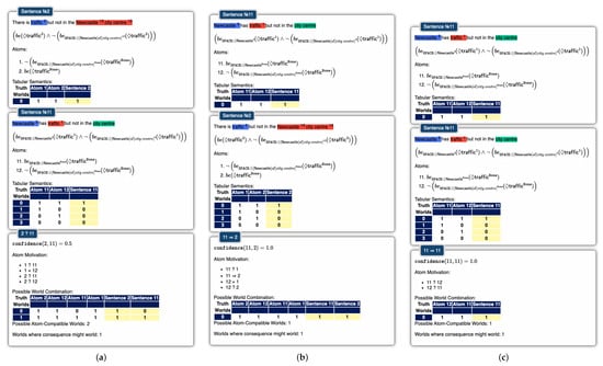 At this stage, we must derive a logic-driven similarity score to overcome the limitations of current symmetrical measures that cannot capture logical entailment. We can then re-formulate the classical notion of confidence from association rule mining [], which implicitly follows the steps of entailment and provides an estimate for conditional probability. From each sentence  and its logical representation A, we need to derive the set of circumstances  or worlds in which we trust the sentence will hold. As confidence values are always normalised between 0 and 1, these give us the best metric to accurately represent the degree of trustworthiness of information. We can then rephrase the definition of confidence for logical formulae as follows: