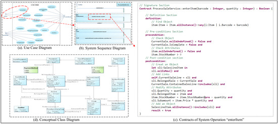 Yang et al. [5] developed a requirements model by pruning UML and extracting components that describe traditional software systems’ requirements. Shown in Figure 1 is a requirement model (CoCoME) of a supermarket example system, through which a supermarket prototype system can be quickly generated for requirements validation. The model comprises a system operating contract and three views: