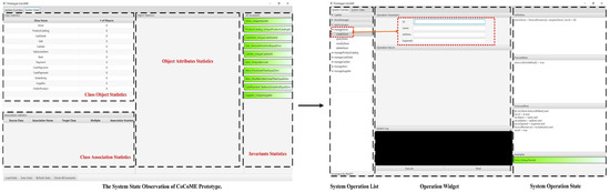As shown in Figure 2, the figure presents an example of manual initialization data construction in the prototype system. The interface in the figure consists of two functional areas on the left and right: the state observation panel of the CoCoME prototype system on the left, and the system function panel on the right. With the help of this prototype interface, the user can complete the initial data entry and configuration through manual interaction. The left side of the figure shows the state observation panel of the CoCoME prototype, which is divided into four main areas. The top left corner shows the names of the current classes in the system and their number of objects, for example, the number of objects in the Store, CashDesk, Sale, and Item classes.