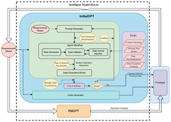 As shown in Figure 3, InitialGPT is an intelligent model-driven approach for automatically generating prototype initialization data to support rapid requirements validation. The purpose of this section is to describe the software architecture of InitialGPT. As shown in Figure 1, InitialGPT takes a requirements model as input and then automatically generates initial data for a prototype system. This process is divided into three distinct phases: