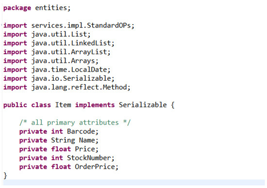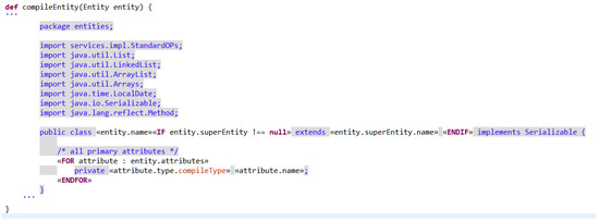 The extraction of domain entities is realized through the EMF model traversal algorithm. Figure 4 shows part of the code template used to convert domain conceptual information into entity class parsing, while Figure 5 is an example of the Xtend-generated entity class code. First, the Xtend generator loads the parsed EMF model instance and calls the eAllContents() method to perform a depth-first traversal to filter out all model elements of type entity. For each entity, its attributes and associative relationships are recursively collected and a lightweight EntityInfo data transfer object is constructed. Attribute mapping extracts the attributes of entity types via an entity.attributes.map, and encapsulates the domain concepts corresponding to each class into the corresponding entity parsing class; the final generated collection of domain entities will be used as the input for subsequent hint template generation. Compared with traditional methods such as regular expressions or template matching, this method ensures syntactic consistency through formal meta-models and supports type-safe model manipulation. We further encapsulate the template code written by Xtend into a scripting tool to form execution scripts applied to the prototyping system platform. The execution scripts can automatically generate the final tool code embedded in the prototyping system, which ultimately realizes the automatic generation of prototype data. Experiments show (see Section 4.1) that the method achieves 98.7% entity extraction accuracy in a requirement model containing 100+ entities.