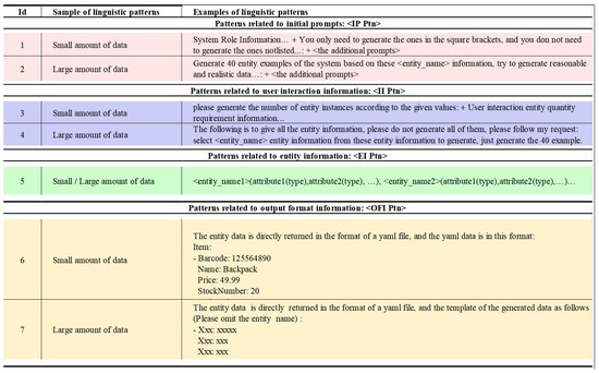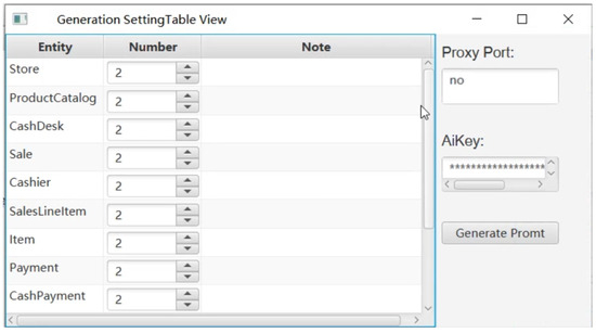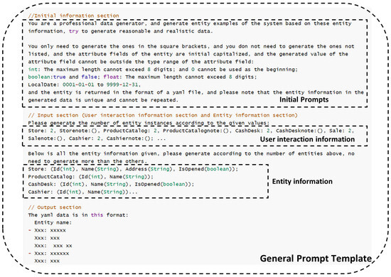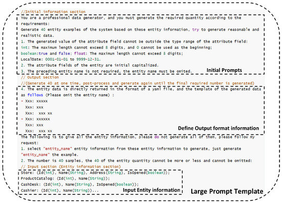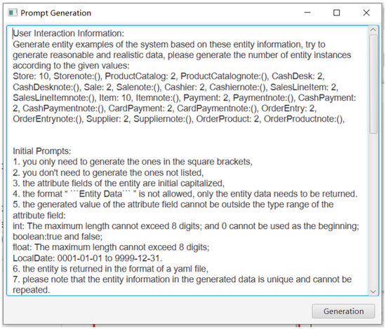 Figure 8 shows an example of a prompt in the CoCoME system that generates a large number of single-class entities individually, constructed using large-scale prompt rules. The large-scale prompt template is similar to the small-scale prompt template, but it is generated for a single entity, 40 entities at a time, and post-processed until the final generated data meet the requirements, at which point it stops. With this template, the model is able to efficiently generate a large amount of structured data in a single request, meeting the needs of system validation, data simulation, and other scenarios.
