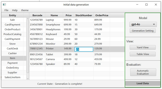InitialGPT realizes user-oriented closed-loop optimization through the interaction interface, which is divided into two key phases: pre-generation configuration and post-generation evaluation. In the pre-generation phase, the system automatically builds an initial prompt template by parsing the demand model, and the user can intervene in multiple dimensions through the visual interface (as shown in Figure 9), including but not limited to setting the number of entity instances (e.g., generating 200 Customer objects), defining attribute constraints (e.g., the OrderDate needs to be in the period of 2020–2023), and selecting the generation strategy (either single-intelligence rapid generation or multi-intelligence precise generation). At the same time, as shown in Figure 10, the system provides prompt word editing functions to allow users to directly modify the automatic prompt template, such as adding domain-specific business rules (“VIP customer order amount should be greater than 500 dollars”). This design transforms the traditional black-box LLM generation process into a transparent and controllable interactive process, effectively reducing the cognitive load on users.