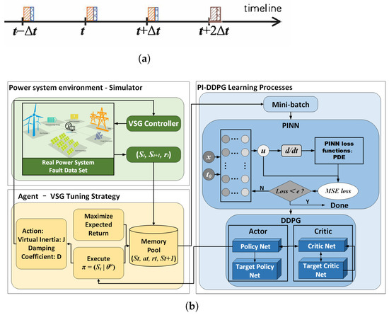 To implement the periodic updating of J and D, the proposed framework follows a two-stage mechanism within each update interval : (1) system state estimation and prediction, and (2) parameter computation and deployment. Specifically, at the beginning of each interval, system-level measurements (e.g., bus voltages, power angles, and load data) are collected from the EMS and fed into the trained physics-informed reinforcement learning (PIRL) agent. The PIRL agent embeds a physics-informed neural network (PINN) to predict the rotor angle trend , which is then combined with the current state vector to form an augmented state input for the Actor network. The Actor network outputs optimized and values for all VSGs through centralized policy inference. These values are then distributed to the corresponding local VSG controllers via the 3N-D module. This inference–deployment cycle is repeated periodically every (e.g., 5–15 min), allowing the system to maintain an updated and anticipatory control strategy.