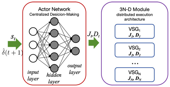 A centralized Actor structure is adopted, as shown in Figure 3. The network takes the complete system state as input and simultaneously generates control parameters for N VSGs through a deep neural network. This design enables coordinated control across VSGs by leveraging global state information.