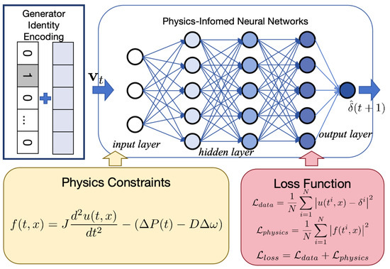 Given the previously detailed dynamic equations, we define as the predicted rotor angle at the next time step. Thus, the PINNs can be expressed as follows:
