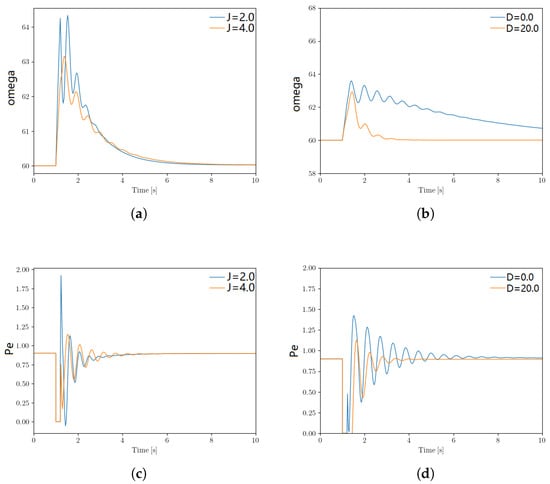 A smaller J results in a larger and , allowing the system to respond more quickly to changes in power or frequency deviation. This improves dynamic performance and responsiveness. However, reduced inertia may lead to larger frequency fluctuations and compromise system stability, as the system becomes more sensitive to disturbances.