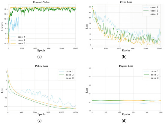 Figure 10 illustrates the reward curves and Critic loss of different algorithms during the training process. In all cases, DDPG and PI-DDPG converge significantly faster than SAC. Due to the guidance of PINNs, PI-DDPG obtains higher rewards in the early stage, which helps guide policy optimization into the correct range, thereby accelerating convergence. Specifically, the reward functions of PI-DDPG and DDPG converge at approximately 200 epochs across all cases, whereas SAC shows signs of convergence around 8000 epochs in Case 1 and Case 2. Notably, in Case 3, SAC does not converge until 10,000 epochs.