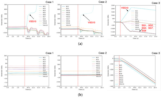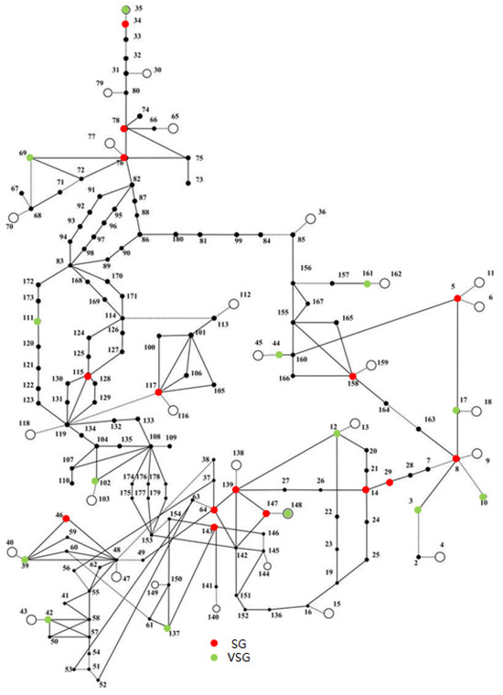 To validate the capability and generalization of the proposed PI-DDPG method in handling complex systems, simulations were conducted on the WECC-179 bus case with a high proportion of renewable energy generation, as illustrated in Figure 10. This case consists of 15 SGs and 14 VSGs, accounting for approximately 50% of the total generation (detailed shown in Figure 12). Faults were introduced at bus 16, 47, 53, 75, 85, 110, and 119, respectively, with tf and tc set as before. The load levels were consistent with the basic case of WECC-179.
