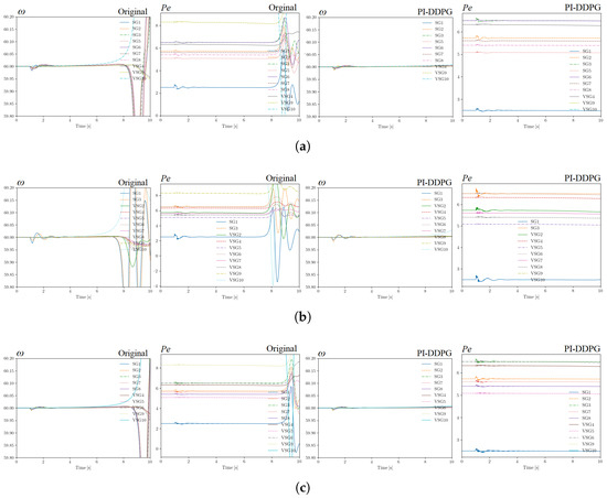 However, with PI-DDPG control, the system’s oscillations are significantly reduced and both and stabilize more quickly across all cases. Even in Case 2 and Case 3, where the uncontrolled system experiences larger disturbances, PI-DDPG ensures a rapid recovery with minimal deviations from the steady-state values.