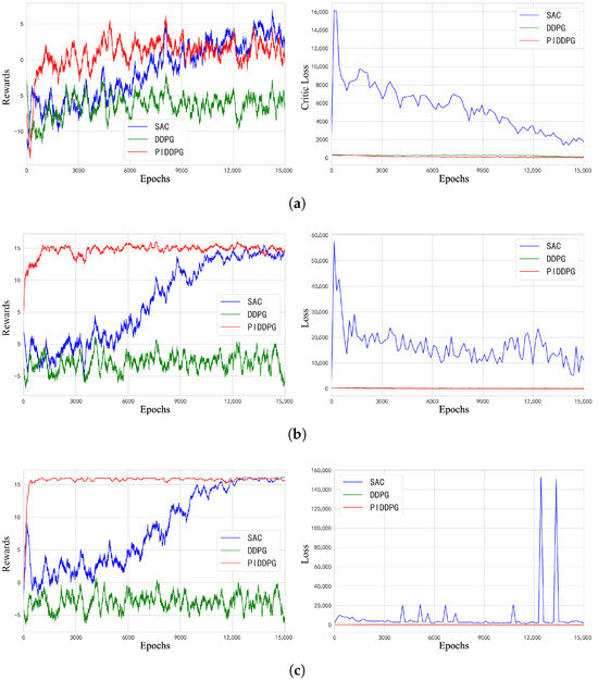 On the other hand, regarding the convergence of the Critic loss function, PI-DDPG and DDPG converge at around 7500 epochs, while SAC continues until the end of the training process. Furthermore, compared to the other two algorithms, PI-DDPG exhibits significantly smaller fluctuations, indicating that the inclusion of PINNs improves the convergence of the reinforcement learning algorithm.