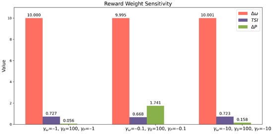 To further evaluate the robustness of the proposed physics-informed reinforcement learning (PIRL) framework, we conduct a sensitivity analysis of the reward weight coefficients. In particular, the rotor-angle-based transient stability index (TSI) is adopted as the dominant term of the reward, while penalty terms associated with frequency deviation () and active power deviation () are considered as auxiliary constraints. To investigate the influence of these penalty coefficients () on the performance and convergence of the control policy, we conducted a sensitivity analysis with three representative settings: