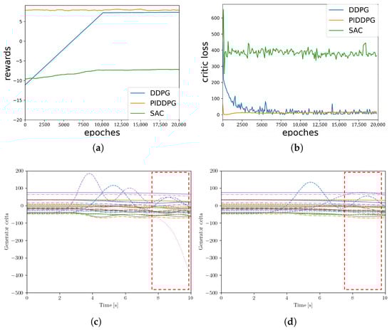 Training performance and deployment of different algorithms on modified WECC-179 bus system. (a) Rewards, (b) Critic loss, (c) without control, (d) and PI-DDPG-based adaptive control.