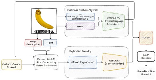 In the era of digital information, memes have emerged as a pivotal component of internet culture, serving as a multimodal information carrier that integrates images and text. Owing to their humorous and highly communicative characteristics, memes significantly shape public communication and influence the public opinion ecosystem. Nevertheless, the ubiquity of memes and their substantial impact render them a double-edged sword. Beyond fulfilling benign entertainment and social functions, memes are increasingly employed as covert instruments for disseminating hate speech, promoting extremist ideologies, spreading misinformation, and engaging in personal attacks [,]. The vast quantity of memes on the internet and social media platforms presents a significant economic burden when manually reviewed. Consequently, there is an urgent need to develop multimodal content understanding technology for the automatic identification of harmful memes. However, the implicit and satirical nature of these harmful memes poses a serious challenge to automatic content moderation systems. In 2020, Facebook hosted the Multimodal Hate Meme Detection competition, marking a significant milestone in research on toxic meme detection []. Numerous datasets have been proposed by researchers, and corresponding recognition methods have been developed, yielding favorable recognition results [,,,]. However, these studies have primarily centered on English memes. Despite some advancements in this area, the body of research concerning Chinese harmful memes remains notably limited.