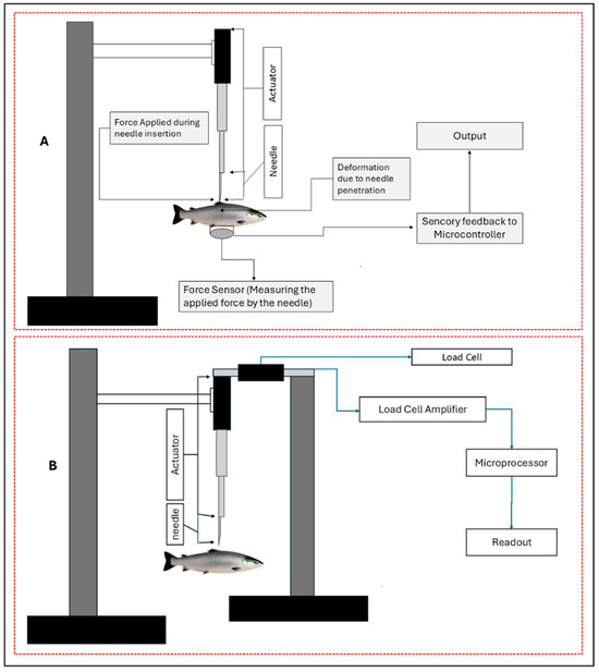 This pilot study was conducted using a single specimen of Atlantic salmon (Salmo salar), which was deceased at the time of experimentation. Therefore, no anesthesia protocols were required, and no blood sampling procedures were performed. The primary objective of this study was to gather force feedback during needle insertion and evaluate tissue deformation resulting from needle insertion using a sensor–actuator setup.
