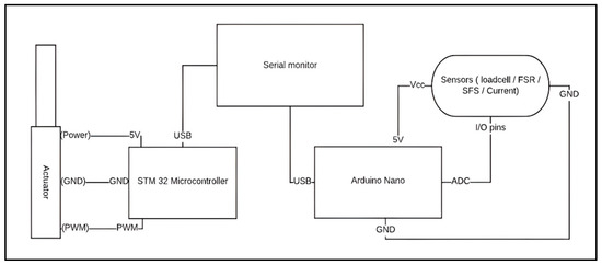 The STM 32 Nucleo-F303RE microcontroller was collected from the University of South-Eastern Norway Electronics Lab. This board has Arduino connectivity support and ST morpho headers. STM 32 Nucleo boards work with an open development platform (Mbed). This board integrates the ST-LINK programmer. The Arduino Nano was purchased from Digi-Key Electronics, Thief River Falls, MN, USA. The Arduino Nano has an ATmega328 microchip. The operating voltage is 5 volts with 8 analog input pins. Each of these analog pins has an inbuilt analog-to-digital converter (ADC) with a resolution of 1024 bits. The microcontroller-embedded board has 22 digital inputs/outputs, including 6 are pulse-width modulation (PWM) pins, consumes 19 mA, and weighs 7 g. The flash memory is 32 (KB), static random-access memory is 2 KB, and the clock speed is 16 (MHz). Moreover, as two microcontrollers were involved in the system (one for driving the actuators and another for collecting sensory data), rather than using multiple power sources, the two microcontrollers shared a common source and completed the circuit.