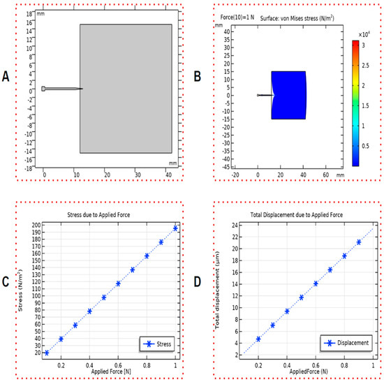 (A) A simulation model of needle and tissue. (B) Represents rupture and deformation events that occurred due to applied force. Tissue deformation and stress are caused around the area of the needle tip. (C) Measuring the tissue stress around the needle tip. Stress is increasing proportionally due to the force. (D) The tissue displacement (μm) around the needle tip from the initial position.