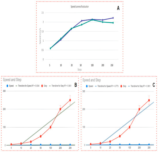 The paired test yielded a score of 0.052, while the two-sample tests produced scores of 0.0534 (unequal variance) and 0.0336 (equal variance). The coefficients of determination (R2) were 0.834 for speed and 0.881 for step, both indicating statistically significant relationships. In Figure 3C, Student’s t-test was performed on step and speed while the actuator was connected to a 5 V power supply, which gave a paired test score of 0.0526, a two-sample unequal variance score of 0.0533, and sample equal variance scores of 0.0335, with the R2-values for speed being 0.8 and the step being 0.881. The Pearson coefficient and level of significance were 0.72 and 0.05, respectively. These analyses proved that there is an association between speed and step. The speed reached 2.13 cm/s at “STEP = 100” in both power sources. Thus, the function ‘STEP = 100’ was taken as a reference value in the programming code to determine the velocity of actuators.