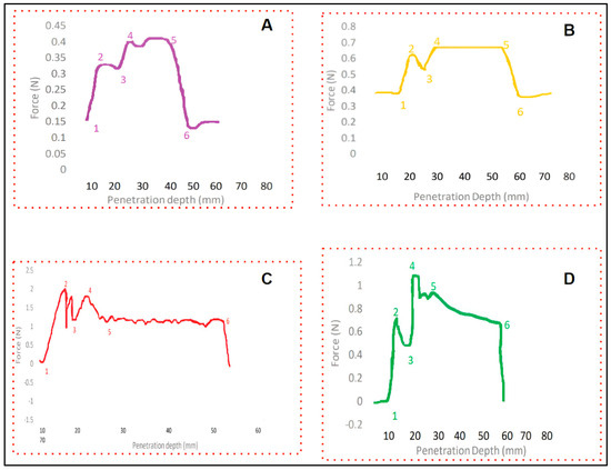 (A) Flexiforce sensory data profile collected from the caudal area of salmon with test setup-1. (B) Force-sensitive resistance sensory (FSR) data profile collected from the caudal area of salmon with test setup−2. (C) Force-sensitive capacitance sensory (FSC) data profile collected from the caudal area of salmon with test setup-2. (D) Load−cell force profile collected from the caudal area of salmon with test setup−2. The needle contacts the specimen at point 1. Between points 2, 3, 4, and 5, various force insertion patterns are observed. Points between 5 and 6 observe a steady state as no insertion has occurred at this stage. The needle is extracted at point 6; the force drops at this stage.