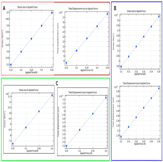 Stress acts linearly to the applied force. In Figure 6A, the skin was penetrated at 0.15 N. At that applied force, the resulting stress was recorded at 0.3 N/m2, and tissue displaced about 5 µm. The force values of the fat layer (0.3–0.35) N were used as input variables in the simulation, and the results were plotted in Figure 6B. It was assumed that at 0.3 N, the needle penetrated the fat layer. At that force, the resulting stress and deformation were found to be 2.95 N/m2 and ~1.18 µm, respectively. Since fat is embedded within the solid muscle structure, the fat layer is considered part of the solid muscle and thus calculated accordingly. Figure 6C represents the region of the tissue layer (0.25–0.4) N. The needle entered the muscle layer at 0.25 N.