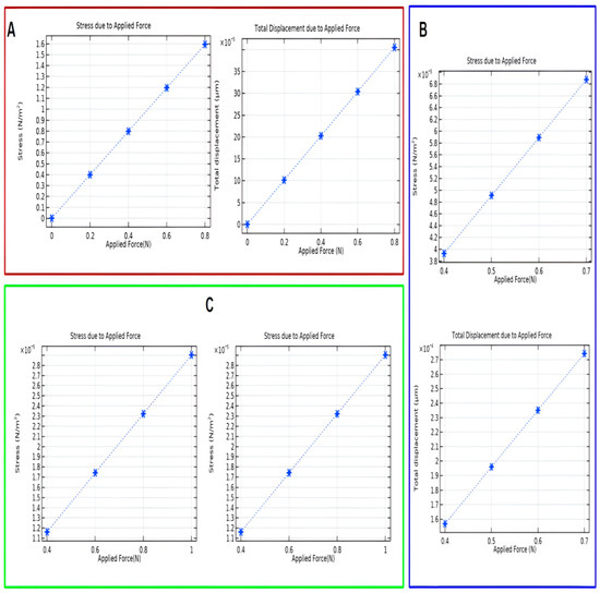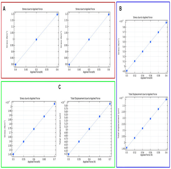 Figure 9 was deduced from Figure 5D. Figure 9A is the skin layer (0–0.8) N where stress is (1. 6 − 0) = 1.6 N/m2 and deformation is (40 − 0) µm = 40 µm. Figure 9B recorded stress and deformation for the fat layer (0.4–0.7) N. The respective results are = 3 N/m2 (6.8 − 3.8) and (2.8 − 1.5) = 1.3 µm. Figure 9C measured stress and deformation for the tissue layer (0.4–1) N. The resulting stress is (2.9 − 1.2) = 1. 7 N/m2 and deformation is (8.8 − 3) µm = 5.8 µm. The results acquired by the sensors and simulation infer that during the needle insertion into salmon tissue, the range of deformation is as low as 0.001 μm up to 8.4 μm, and stress is 0.3 N/m2 up to 4.9 N/m2.