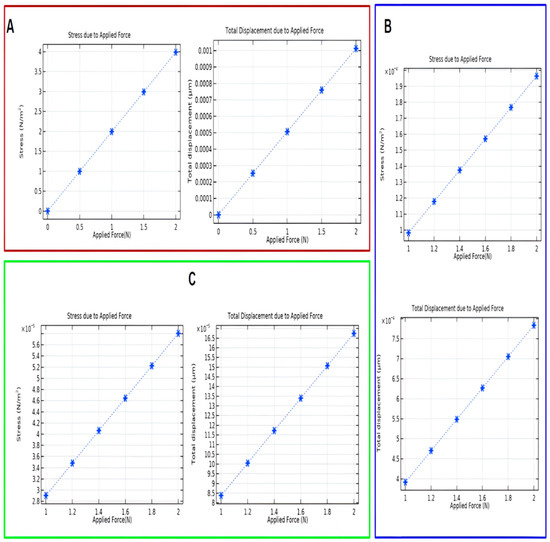 Figure 8 recorded stress and deformation measurements from Figure 5C. The given skin region in Figure 8A is between (0–2 N) = 2 N. The resulting stress and deformation are = 4 N/m2 (4 − 0) and (0.001 − 0.0001) µm = 0.0009 µm, respectively. Figure 8B (1–2 N) measured stress and deformation for the fat layer, which is = 1 N/m2 (2 − 1) and (8 − 4) µm = 4 µm. Figure 8C is the measurement for salmon tissue (1–2 N). Stress is = 3 N/m2 (5.8 − 2.8), and deformation (16.5 − 8.5) µm = 8 µm.