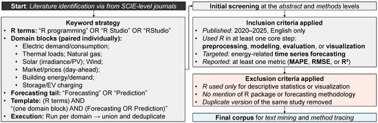 This review applied strict inclusion criteria based on publication year, keyword relevance, and tool usage to reflect recent trends and innovations in R-based energy forecasting. For instance, only studies published between 2020 and 2025 were included because this period represents a notable shift in data accessibility and modeling sophistication in the energy analytics field. This temporal scope ensures that the corpus reflects current best practices while avoiding outdated methodologies.
