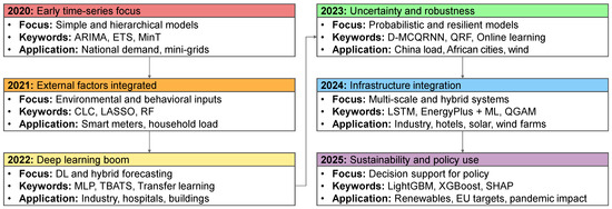 Within this study, we classified the literature into six overarching domains: electricity forecasting, energy forecasting in buildings, solar energy forecasting, wind energy forecasting, thermal and gas energy forecasting, and hybrid or emerging systems such as electric vehicles and energy storage. The studies within each domain were arranged chronologically, enabling readers to follow the progression of methodologies from earlier contributions to more recent advances. This organization provides a comprehensive overview across diverse energy sectors while also facilitates an understanding of the technological trends and research trajectories that have shaped the field over time.